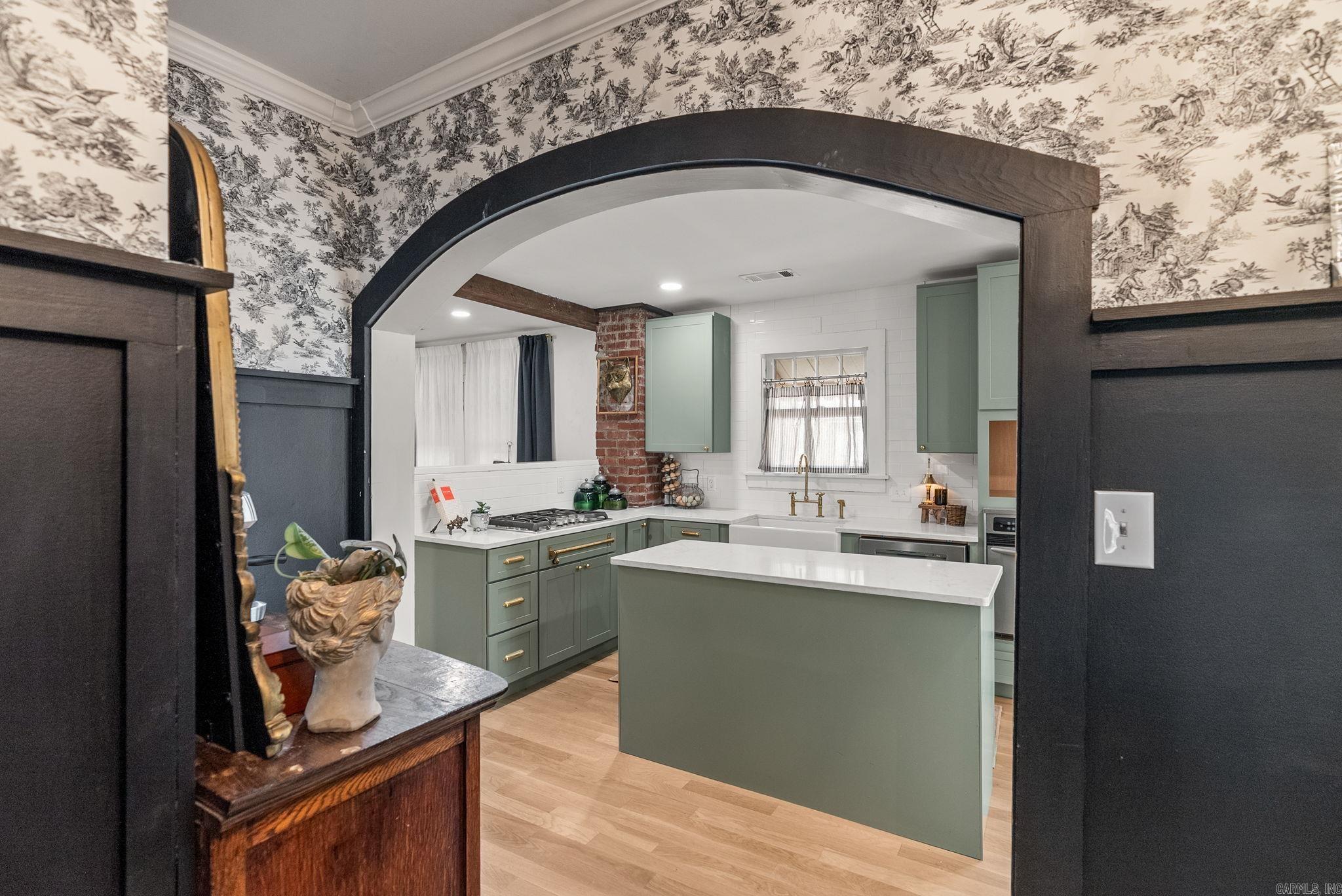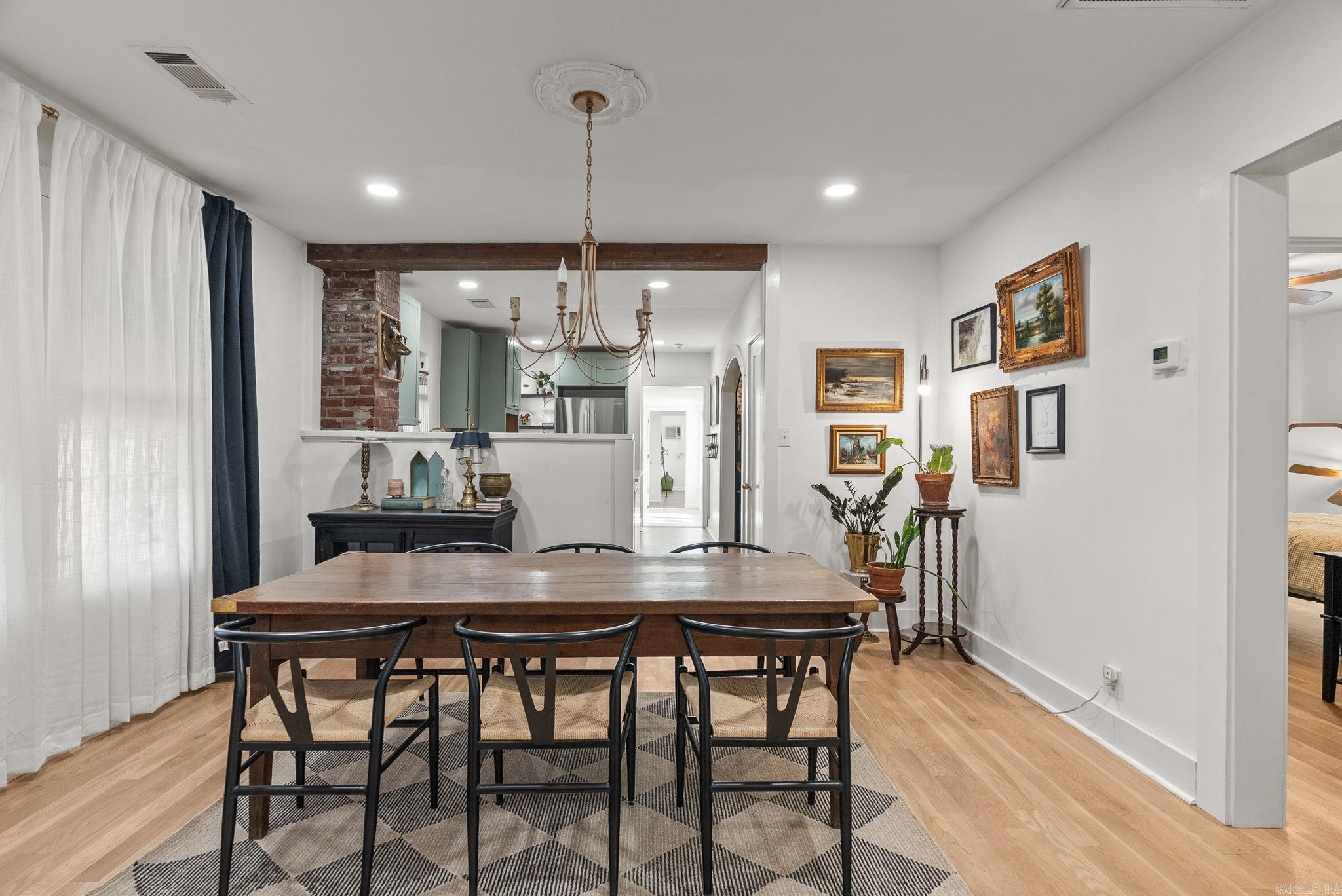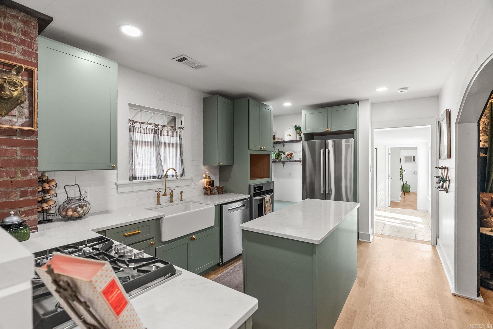 Welcome to 5300 C St, your Hillcrest story come to life. A classic bungalow that holds onto its soul while embracing the modern. Step inside where you're welcome by hardwood floors, guiding you to a living room anchored by a brick fireplace. It's the kind of space where quiet mornings with coffee and lively evenings with friends both feel right at home. At the front, 2 bedrooms are split by a charming full bath -- a layout that feels both practical and inviting. Tucked at the rear, you'll find a private 3rd bedroom with an ensuite bath, perfect as a guest retreat, home office, or primary hideaway. The dining room flows into a fully reimagined kitchen -- a designer's mix of sage cabinetry, brass fixtures, quartz counters, & exposed brick. Every detail honors historic charm while creating a fresh stage for modern living. With a new roof in 2022 + thoughtful updates throughout, this home is as functional as it is beautiful. And then there's Hillcrest, a neighborhood that plays like a film set: walkable streets, porch-front hellos, local shops and cafes that know your order. Life here is vibrant, connected, and distinctly Little Rock. Come on over to C Street and start your next chapter.
