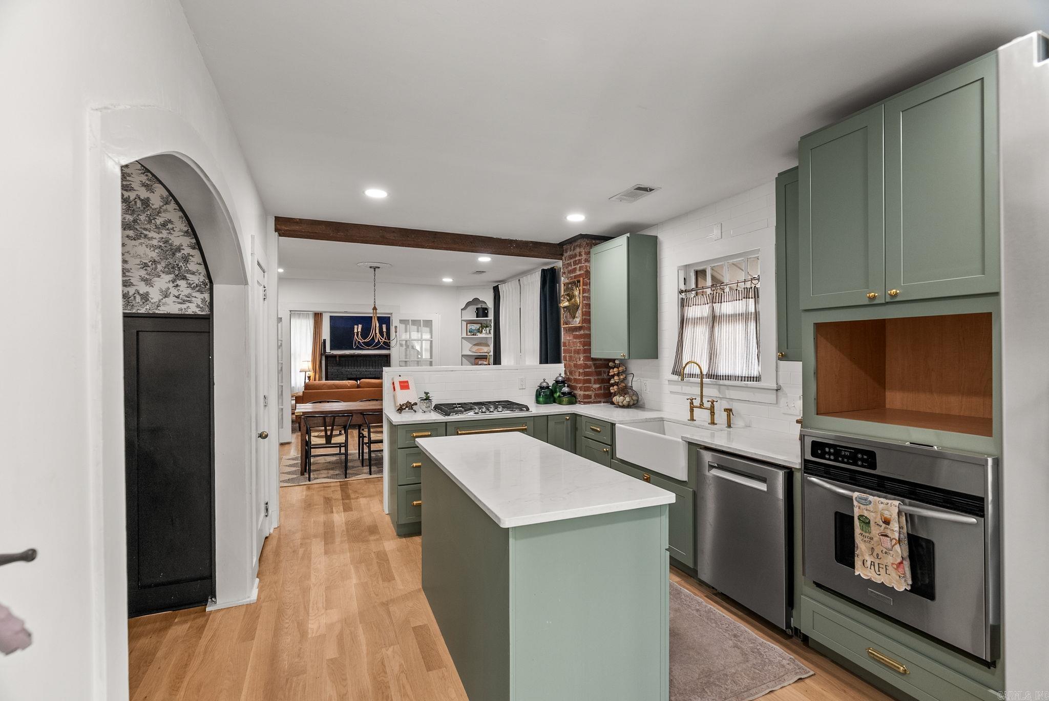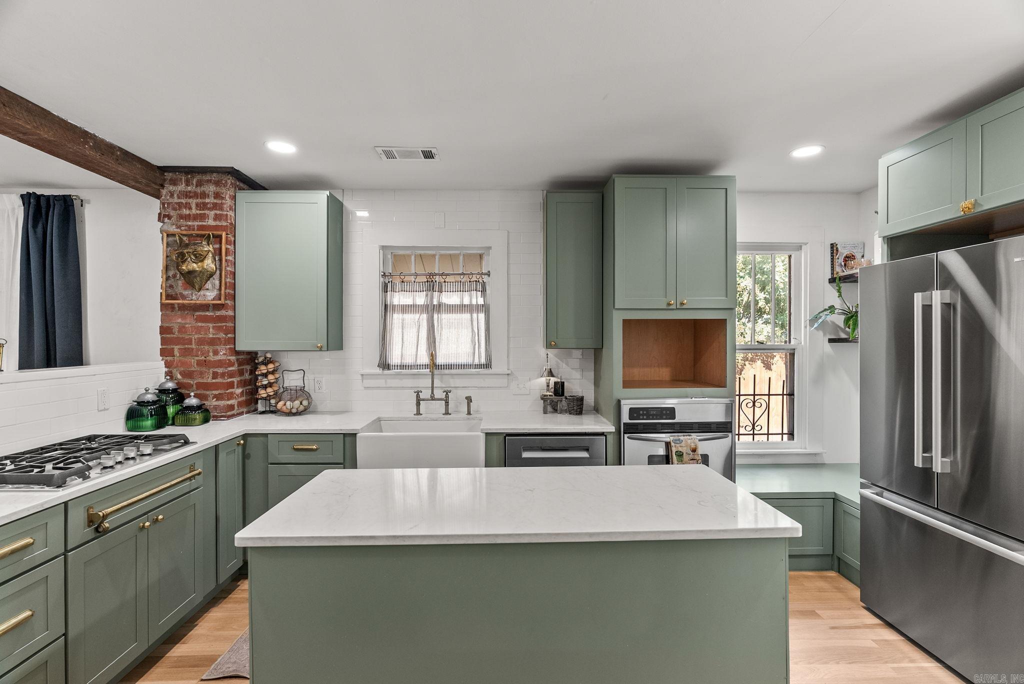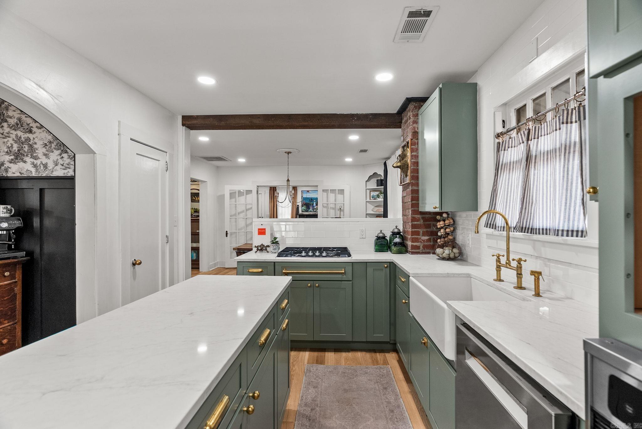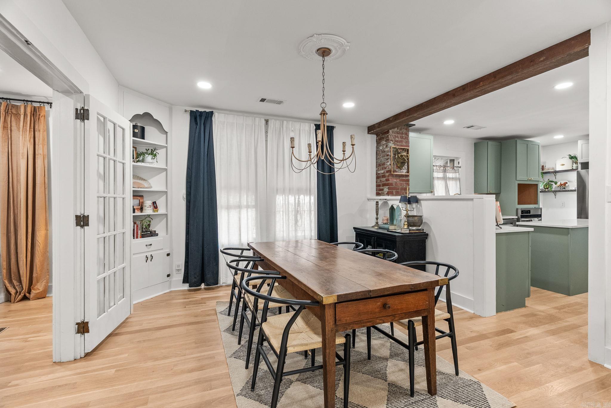 Welcome to 5300 C St, your Hillcrest story come to life. A classic bungalow that holds onto its soul while embracing the modern. Step inside where you're welcome by hardwood floors, guiding you to a living room anchored by a brick fireplace. It's the kind of space where quiet mornings with coffee and lively evenings with friends both feel right at home. At the front, 2 bedrooms are split by a charming full bath -- a layout that feels both practical and inviting. Tucked at the rear, you'll find a private 3rd bedroom with an ensuite bath, perfect as a guest retreat, home office, or primary hideaway. The dining room flows into a fully reimagined kitchen -- a designer's mix of sage cabinetry, brass fixtures, quartz counters, & exposed brick. Every detail honors historic charm while creating a fresh stage for modern living. With a new roof in 2022 + thoughtful updates throughout, this home is as functional as it is beautiful. And then there's Hillcrest, a neighborhood that plays like a film set: walkable streets, porch-front hellos, local shops and cafes that know your order. Life here is vibrant, connected, and distinctly Little Rock. Come on over to C Street and start your next chapter.